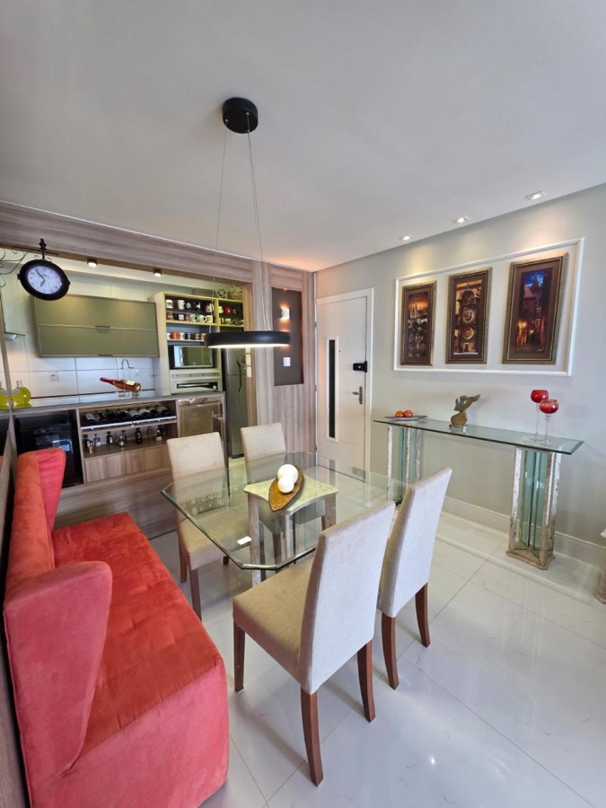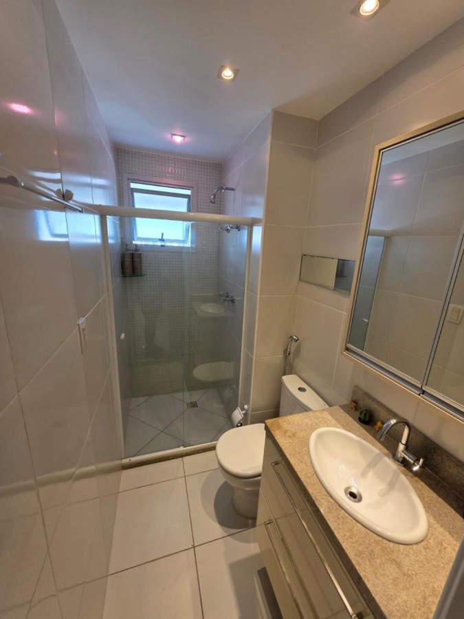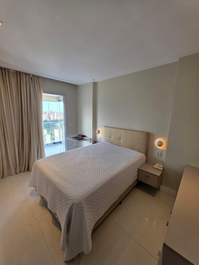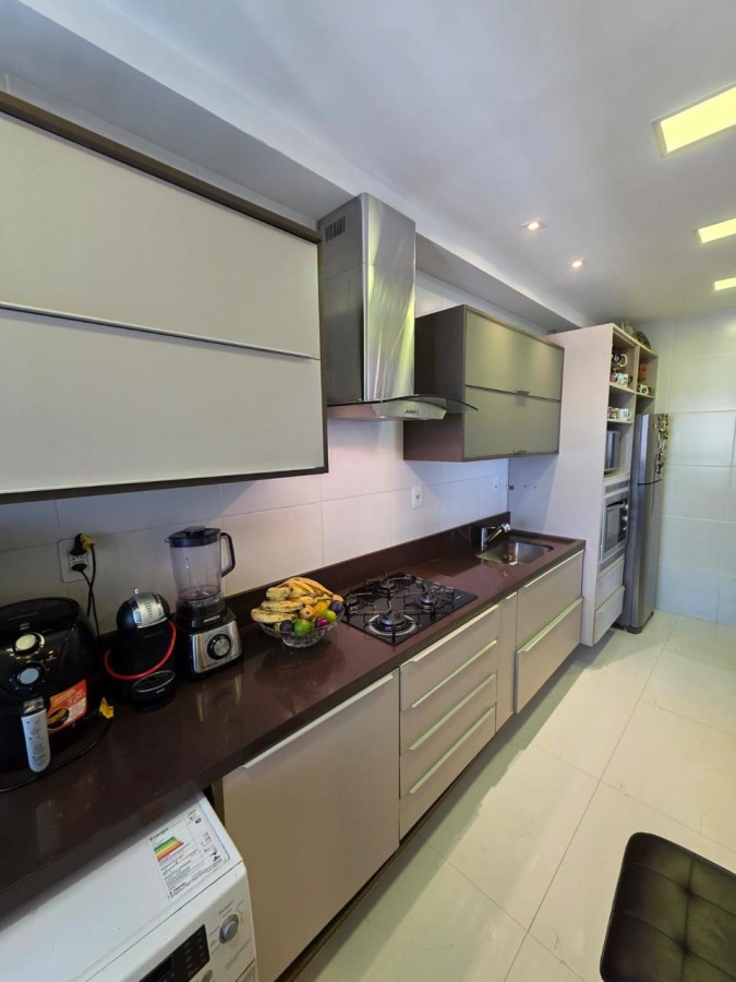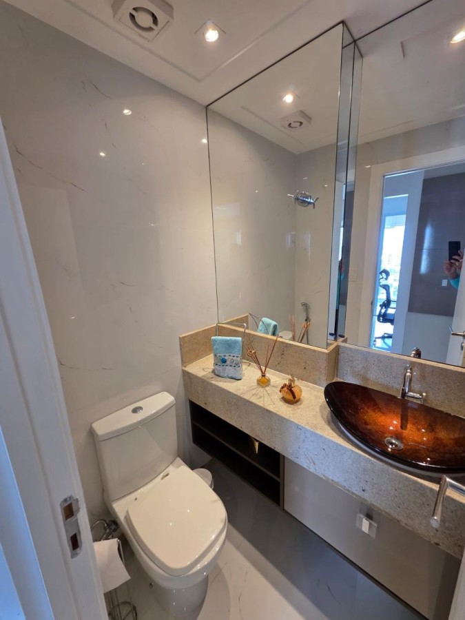São 2 suítes, originalmente com 3/4 e a suíte principal encontra-se com 2 banheiros e closet, 92m², nascente, vista linda, lavabo, varandão gourmet com fechamento com cortina de vidro, armários planejados em todos os ambientes, cozinha americana equipada, área de serviço, andar altíssimo, 2 vagas de garagem soltas, banheiro de serviço, água aquecida por energia solar.