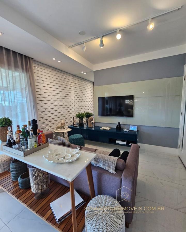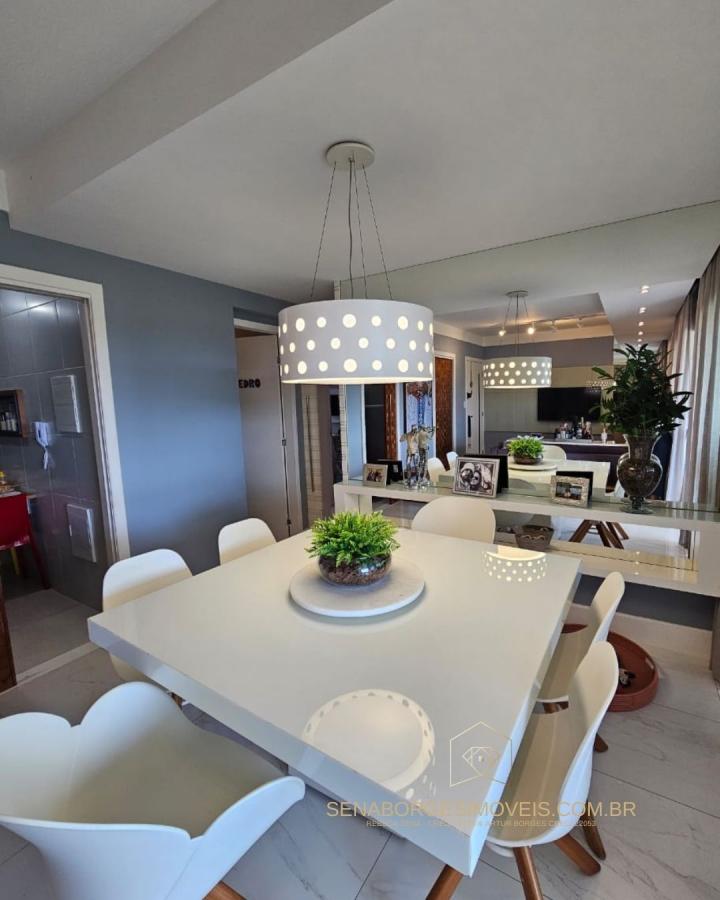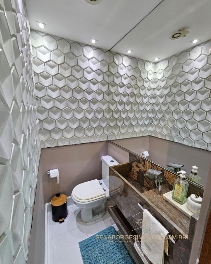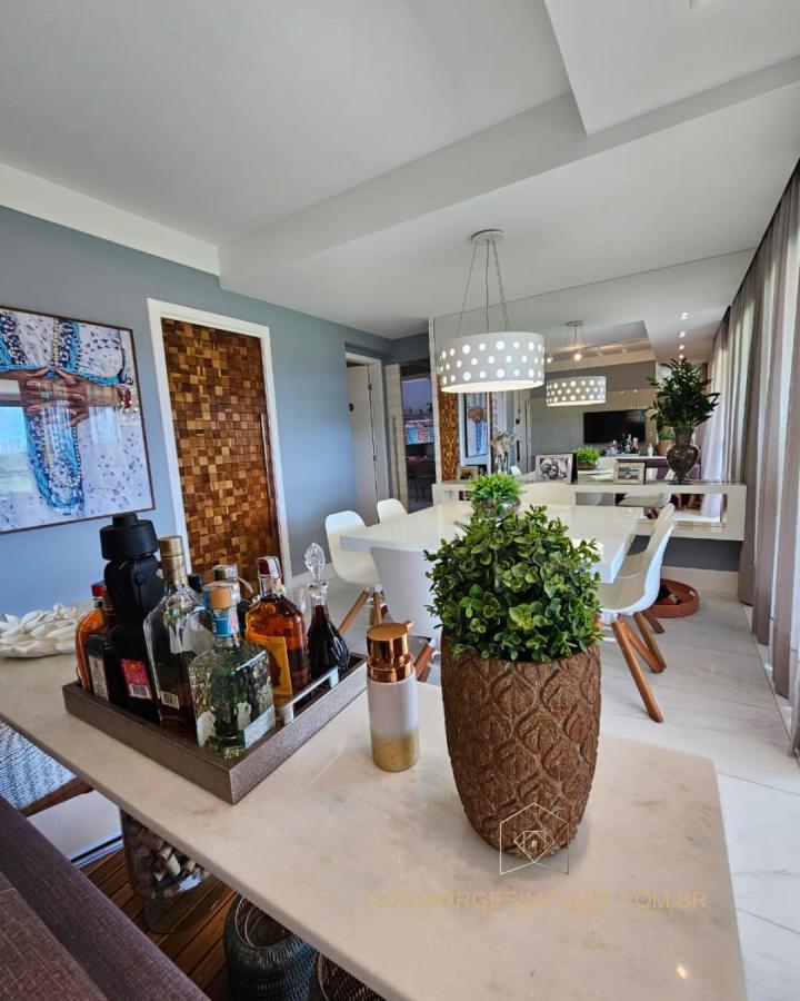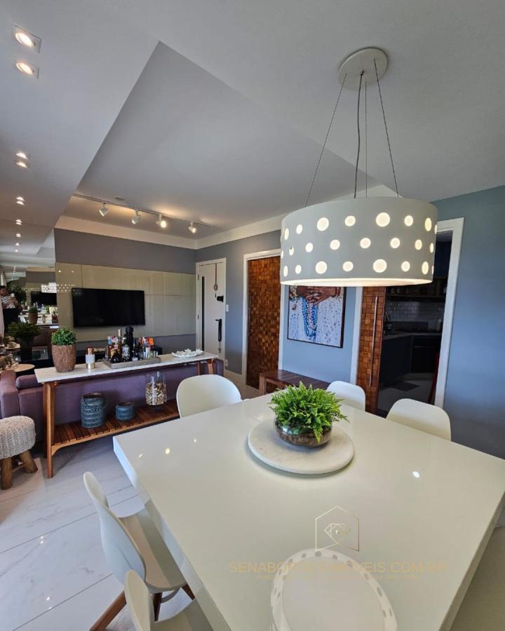 São 4/4 sendo uma suíte, 120m², finamente decorado com acessórios de altíssimo padrão, lavabo, varanda gourmet com churrasqueira de carvão e fechamento de vidro, banheiro de serviço, 2 vagas de garagem.
