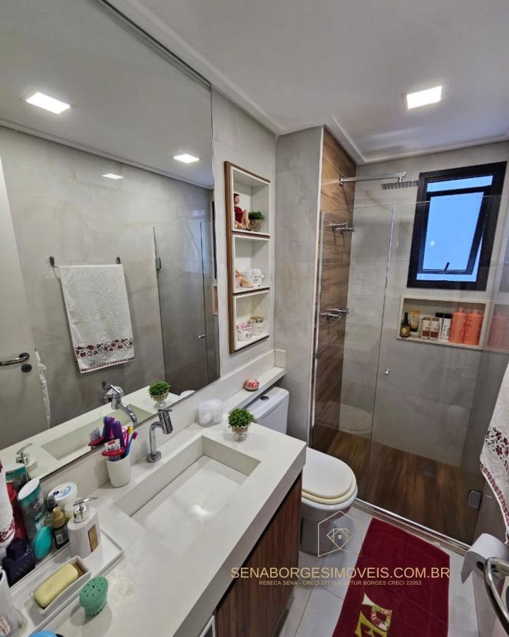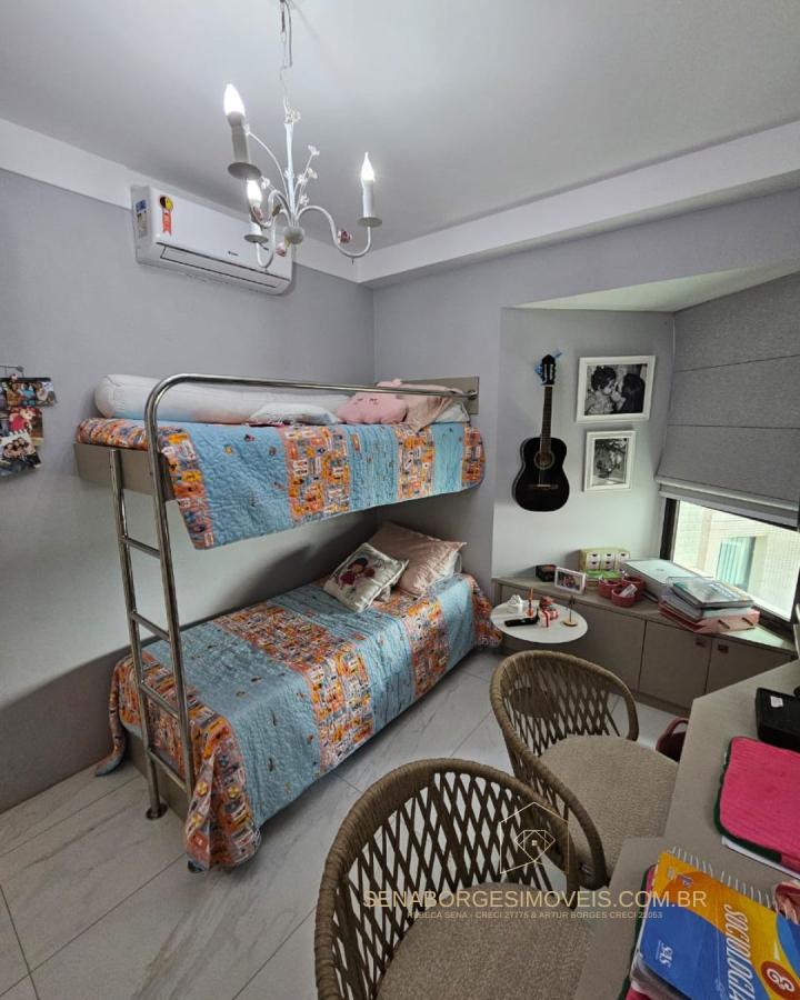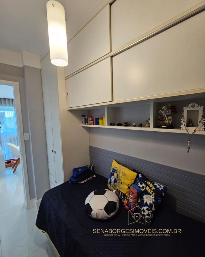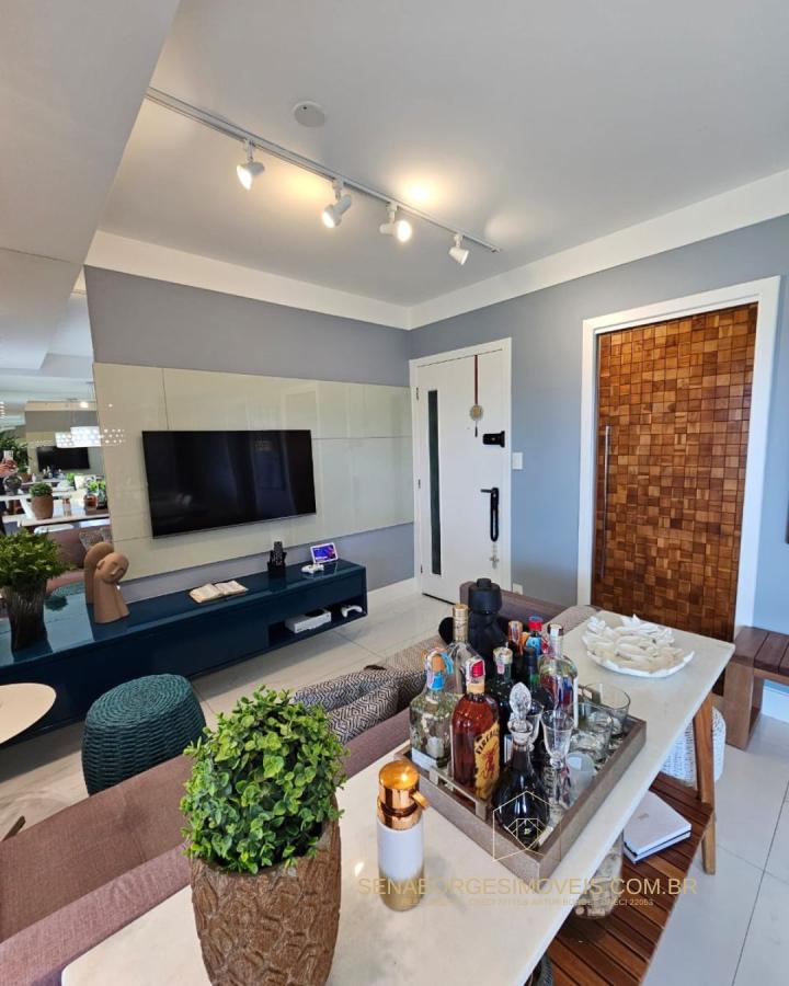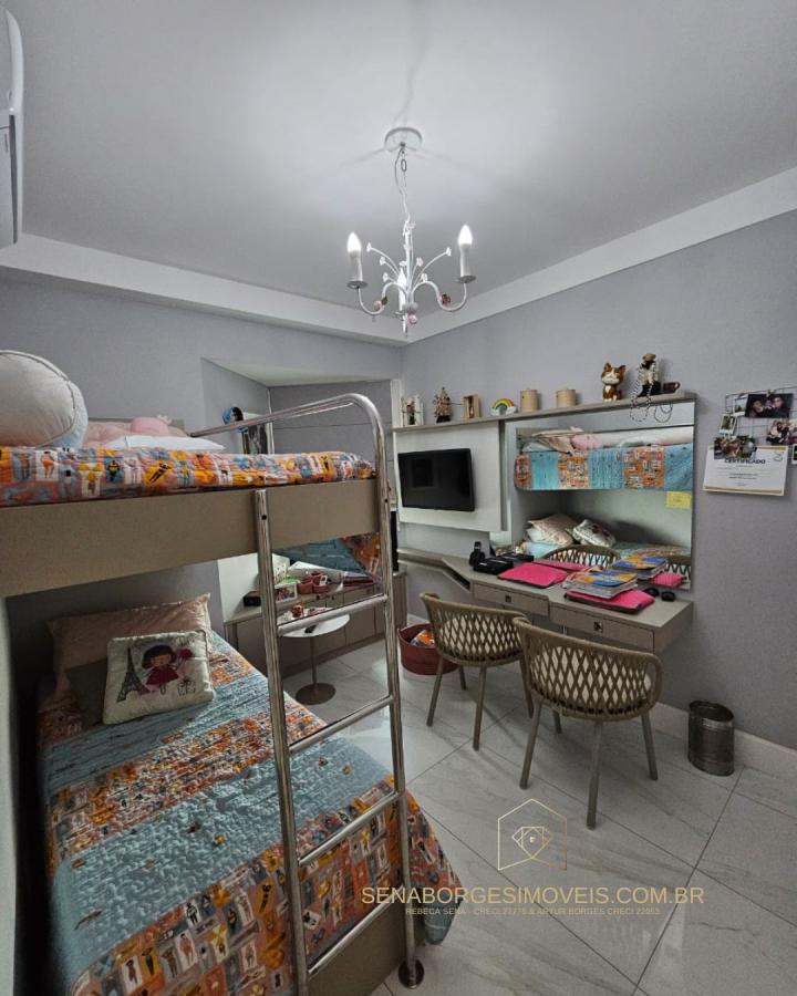 São 4/4 sendo uma suíte, 120m², finamente decorado com acessórios de altíssimo padrão, lavabo, varanda gourmet com churrasqueira de carvão e fechamento de vidro, banheiro de serviço, 2 vagas de garagem.