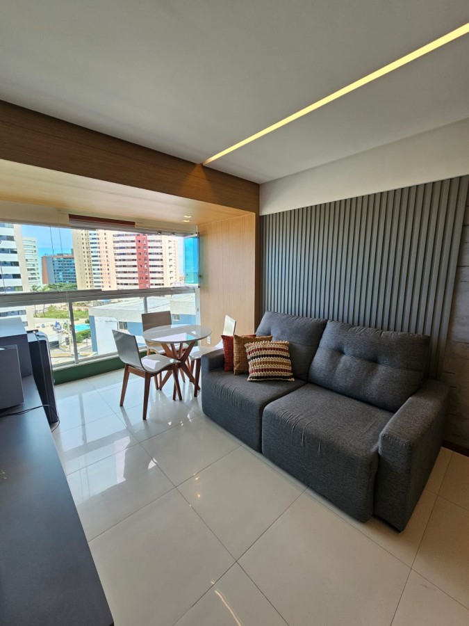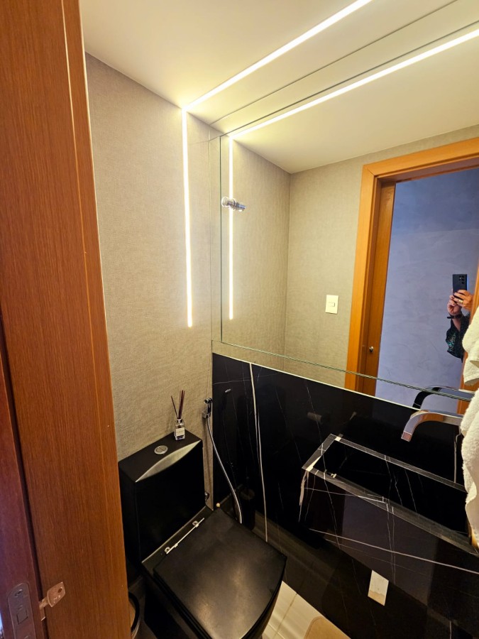 Um quarto e sala, de 47m², finamente decorado, lavabo, mobiliado, nascente, varanda gourmet com fechamento de vidro, cozinha americana, 1 vaga de garagem.