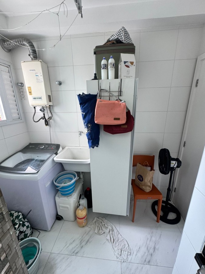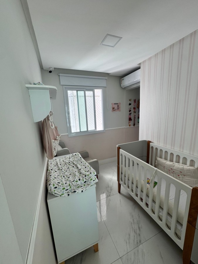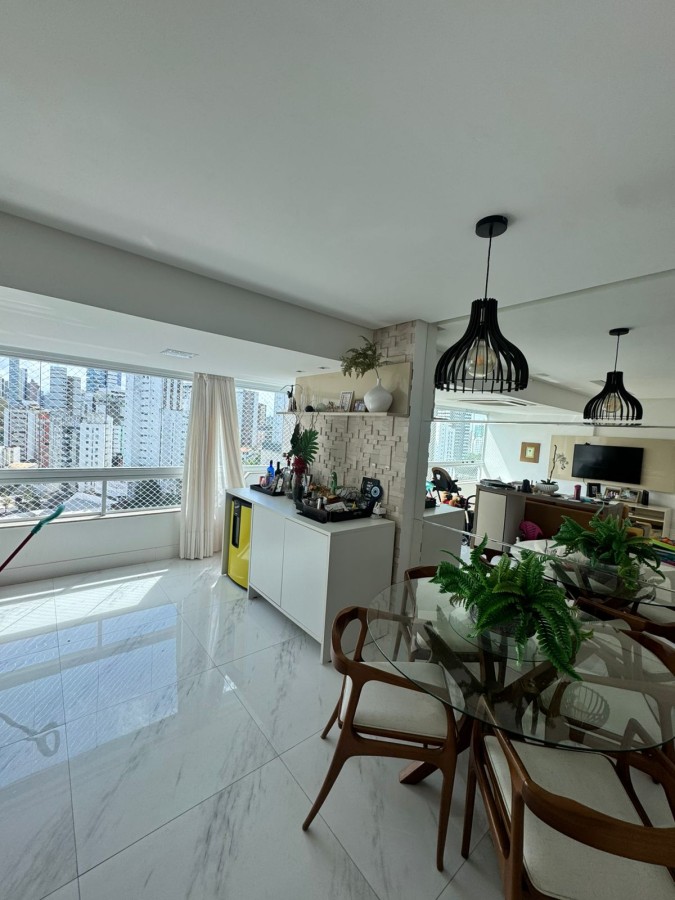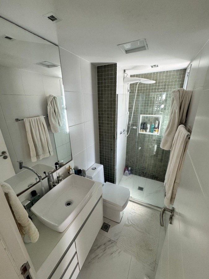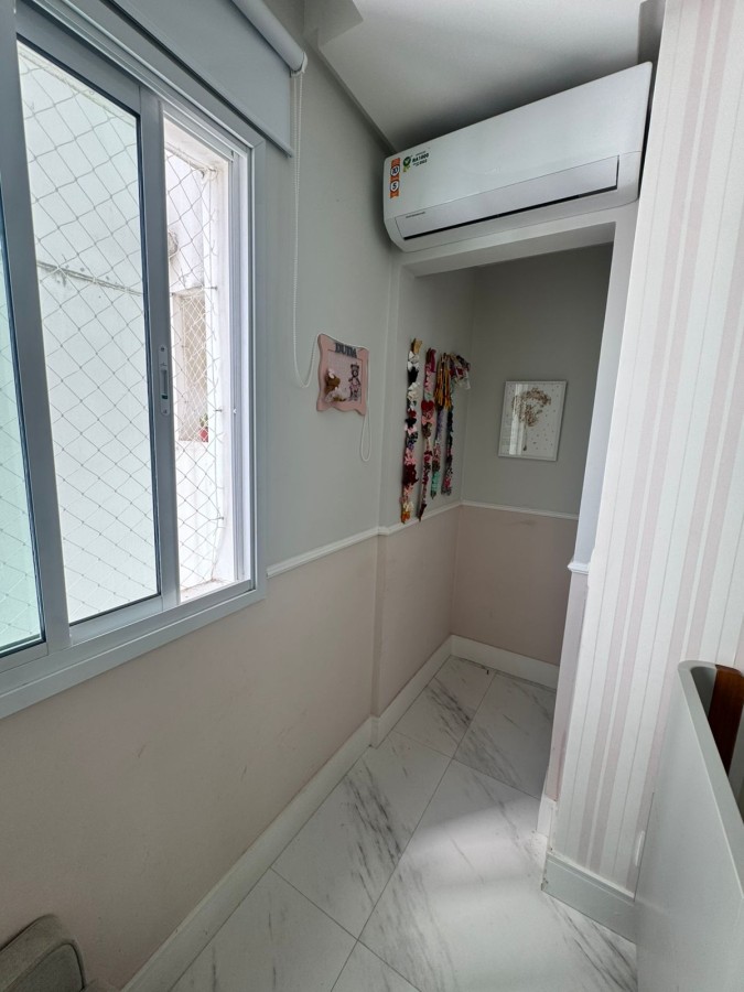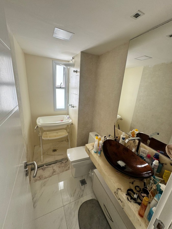 São 2 suítes, closet, planta original de 3/4, 91m², sala ampla em 2 ambientes, decorado, banheiro social, área de serviço com banheiro de apoio, 2 vagas de garagem